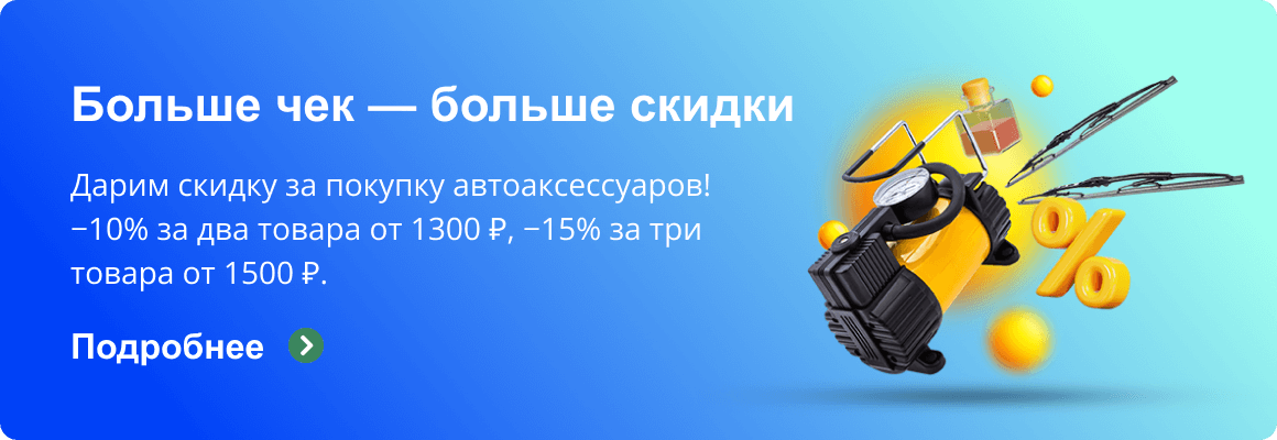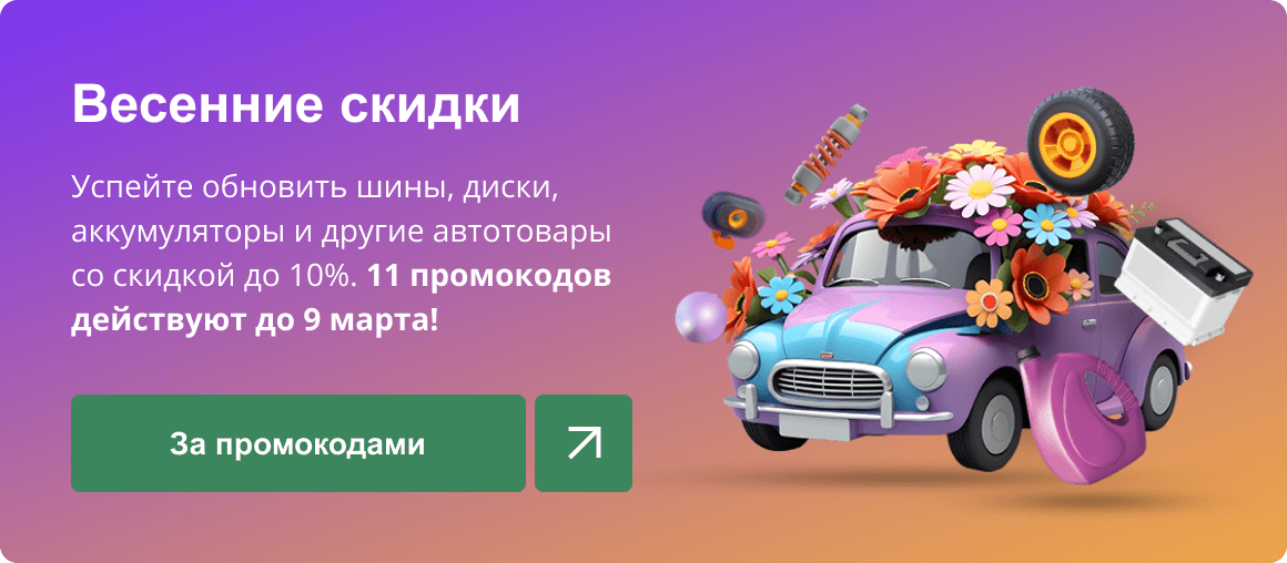 Промокод действует с 5 по 9 марта 2025 года на все автотовары, кроме шин, дисков и колес в сборе. Скидка по промокоду не суммируется с другими скидками и акциями.